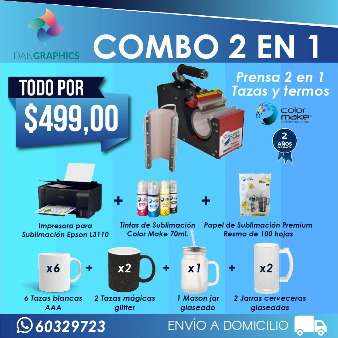 Este combo 2 en 1 es ideal para empezar en el arte de la sublimación la cual incluye los equipos y materiales para inmediatamente iniciarse. Además viene con algunos insumos para practicar y a la vez sirvan de muestras para los clientes.